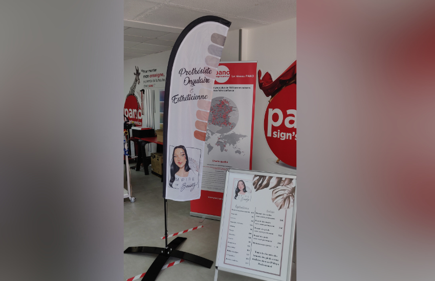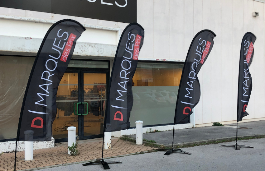 Le drapeau publicitaire se compose de trois éléments : une base appelée platine ou croix, indispensable pour maintenir solidement l’ensemble au sol, un mat démontable en aluminium qui peut être de différentes formes (goutte, plume, arrondi ou rectangulaire) et une voile en polyester personnalisée.